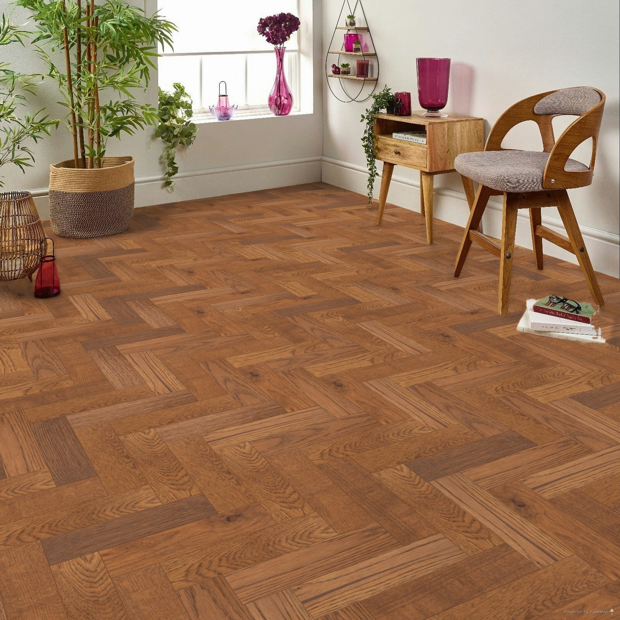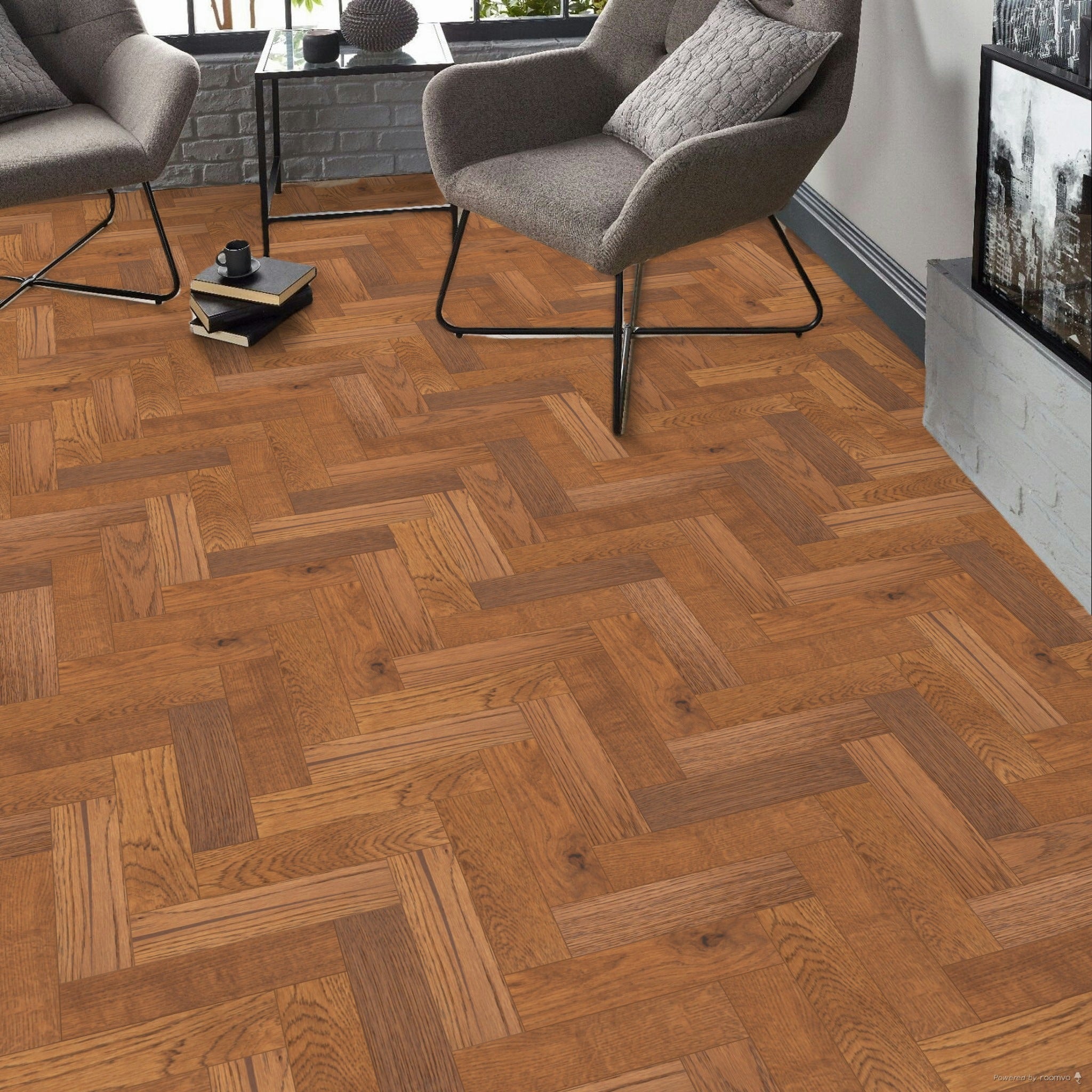 Designed to be compatible with underfloor heating, the Amberwood flooring adds comfort to your space throughout the year. It can be installed using nailed or glued down methods, offering flexibility to suit various installation preferences. Perfect for bedrooms, dining rooms, kitchens, and lounges, this flooring features a timeless herringbone/parquet pattern that enhances any interior with its classic appeal.