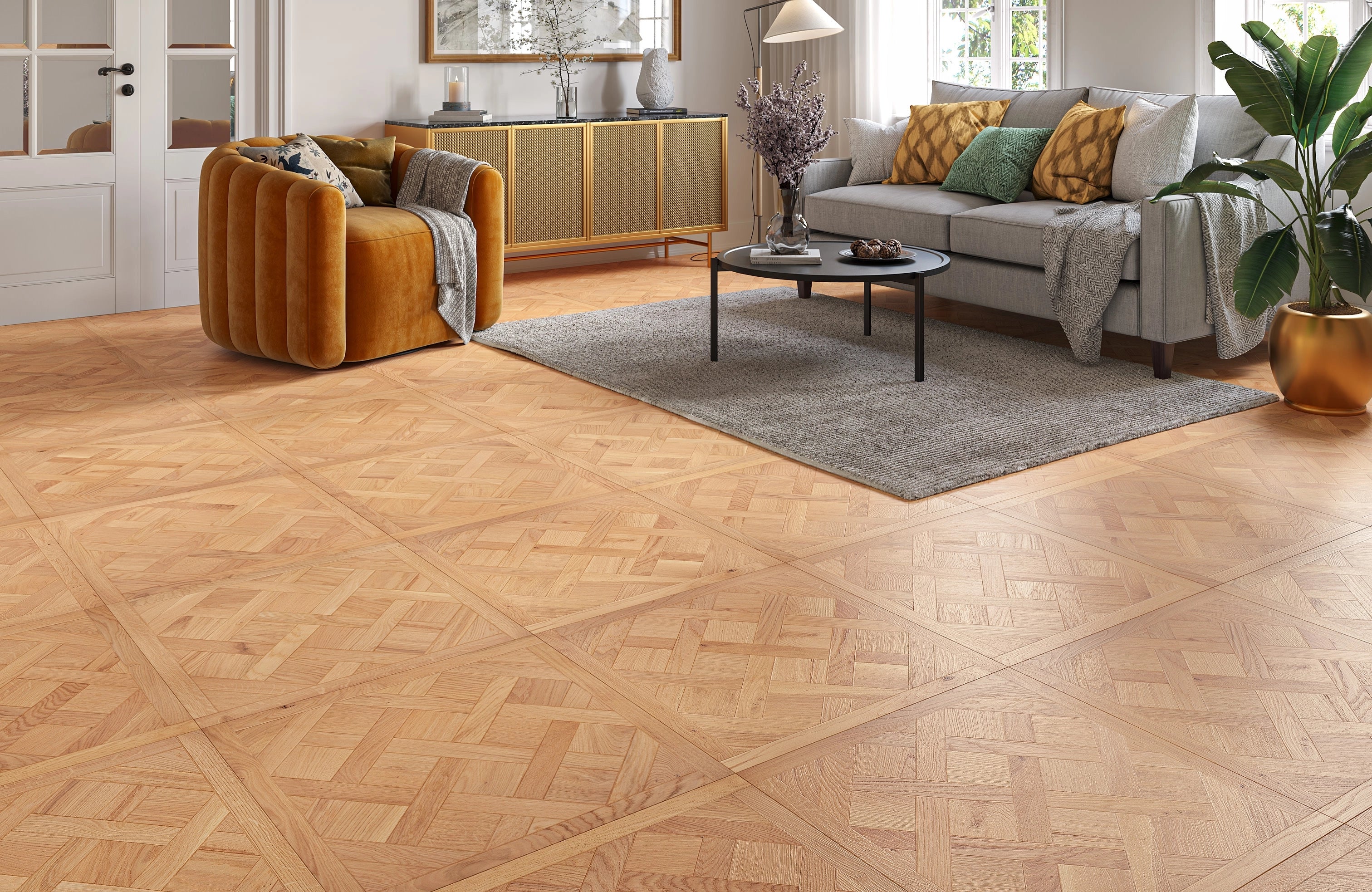 The 4-sided micro bevel enhances the definition of each panel, showcasing the intricate Versailles design. Featuring a traditional tongue and groove system, this engineered oak flooring can be installed floating, nailed, or glued down, providing flexibility for a wide range of subfloors and room types. Each pack covers 2.88 m², making it ideal for both large and intimate spaces.